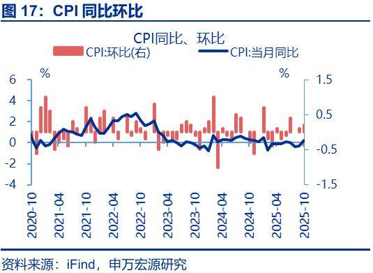 因素三:核心CPI继续回升,更多是出行需求改善及金价上涨的支撑。10月,核心CPI同比上行至1.2%。拆分结构看,核心服务CPI整体(环比0.3%)明显好于季节性,主因国庆、中秋双节叠加,出行需求较旺,宾馆住宿、飞机票和旅游价格分别上涨8.6%、4.5%和2.5%,同时统计在食品中的在外餐饮CPI也有改善(同比+0.1pct至1.7%)。而青年失业率仍在高位下,租房需求较弱令10月房租CPI(环比0.1%)不及往年同期(0.3%)。核心商品CPI同比上行0.2pct至1.6%,更多来自金价上涨的支撑。10月中下旬金价有所回落,但全月仍呈上涨态势,继续支撑国内金饰品和铂金饰品价格(同比分别50.3%、46.1%)。
