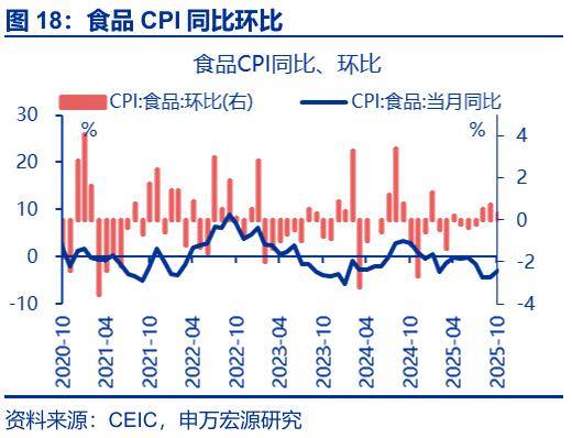 因素二:10月CPI回升至0以上,源于低基数与部分细项供给减少推升食品CPI,受反内卷影响较大的猪肉价格仍在低位。10月CPI环比0.2%,略高于2017年以来的均值(0.15%);CPI同比较前月上行0.5pct至0.2%。结构上低基数下,食品同比上行1.5pct至-2.9%。其中鲜菜、鲜果CPI同比分别上行6.4、2.2pct;且供给减少下,其CPI好于往年同期。相比之下,受反内卷影响较大的猪肉价格仍维持低位,猪肉CPI同比为-16%。