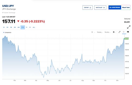 这一庞大的刺激计划此前已引发了市场对日本财政状况恶化的担忧,日元汇率与日本国债本月几乎同步大跌。尽管11月21日刺激计划正式公布后,美元兑日元小幅回落,短暂走低至157.20,但随后再度反弹,逼近可能触发日本央行干预的区间。自从9月以来,日元已在G10货币中领跌;日本10年期国债收益率本周早些时候也进一步跃升至了17年来的最高位。