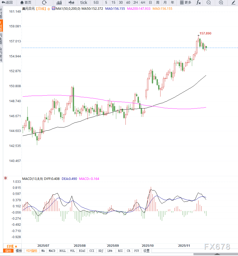 汇通财经APP讯——周四(11月27日)亚洲时段,日元出现显著反弹,美元/日元自156.40附近快速下行,最低触及155.70附近,下方关键支撑在21日均线整数关口附近。此轮日元上涨并非单纯的技...