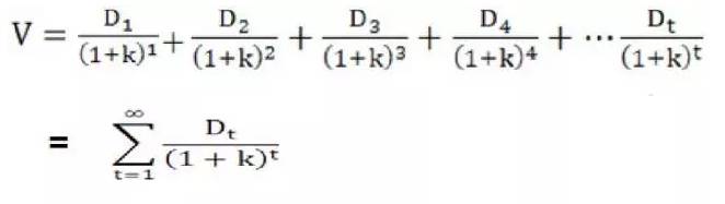 从公式中可以看出,Dt固定的情况下,V和K成反比例关系,即K(市场利率)越大,V越小,即股价越低。