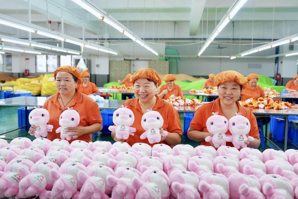 在东莞的文博工艺品有限公司生产车间里,流水线高速运转,工人加班加点赶工,一箱箱封装完毕的吉祥物周边正排队上货柜。