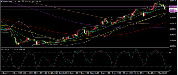 周三金价高位回落,低见1201美元。就线路来看,昨日金价黑棒下跌,失守1210美元且测试1200美元支撑,目前处5日均线附近震荡,就技术指标日KD与4小时KD皆出现翻空迹象、加以美元短线又出现转强下,短线金价仍有震荡测支撑机会,然未来美元指数强弱,仍将攸关黄金涨跌,料支撑1200、1195元,压力落1210、1220美元。