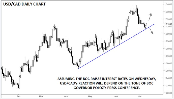 如果Poloz看淡与美国紧张的贸易局势(包括北美自由贸易协定崩溃的可能性),转而关注强劲的国内经济,则美元/加元可能突破上涨趋势线。但若对经济的评估较为温和,则即使央行加息,都可能推低加元,并带动美元/加元多头再度上看1.33上方的6月底高点。