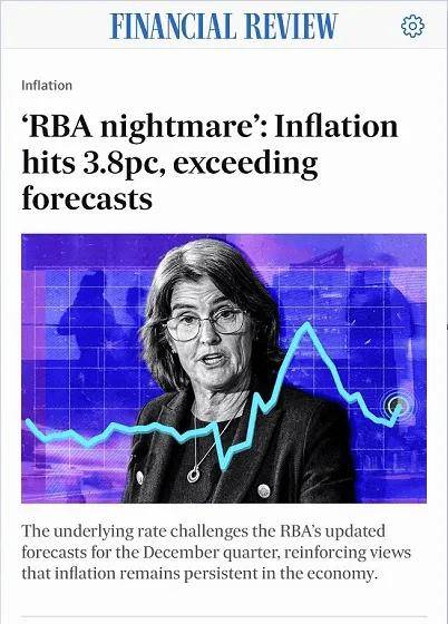 最新公布的CPI数据,远超市场预期,对于市场降息的预期,无疑是一记重击。今日AFR的报道所用的“RBA Nightmares ”标题,表明最新CPI数据,对于利率政策决策者的RBA澳储行而言,发出了是一个令人不安的信号———抵御通胀之路依旧任重道远。